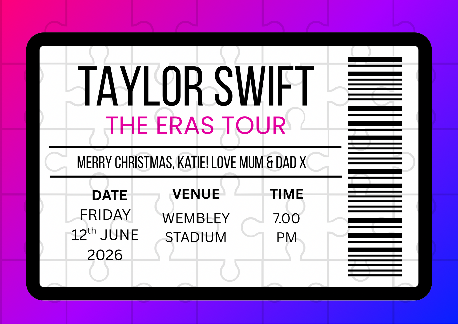 Create an engaging and unique gift experience with our Pink Event Ticket Custom Puzzle. This puzzle combines the fun of solving a puzzle with the excitement of receiving a concert ticket as a gift. Perfect for any music lover, theatre fanatic or festival go-er. It’a a thoughtful way to make their next concert experience even more memorable!