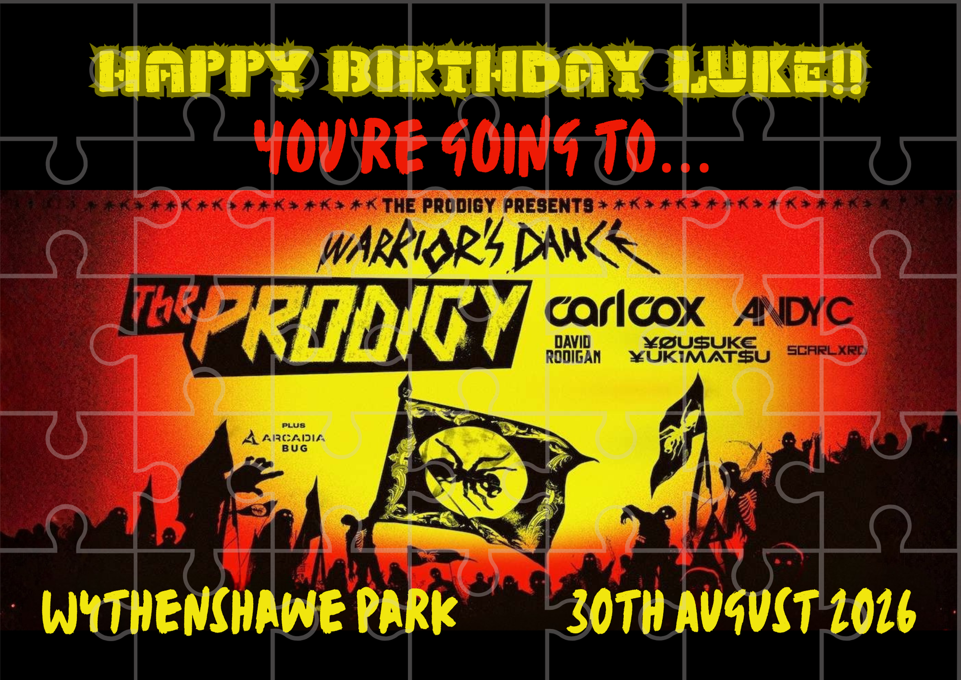 Create an engaging and unique gift experience with our custom event ticket puzzle. This jigsaw combines the fun of solving a puzzle with the excitement of receiving a concert ticket as a gift. It’a a thoughtful way to make your gift extra special - perfect for any music lover! Solve the personalised jigsaw and reveal your surprise of tickets to see The Prodigy. The Prodigy will perform at the park on the August Bank Holiday next year alongside Carl Cox, Andy C, ¥ØU$UK€ ¥UK1MAT$U, David Rodigan & SCARLXRD
